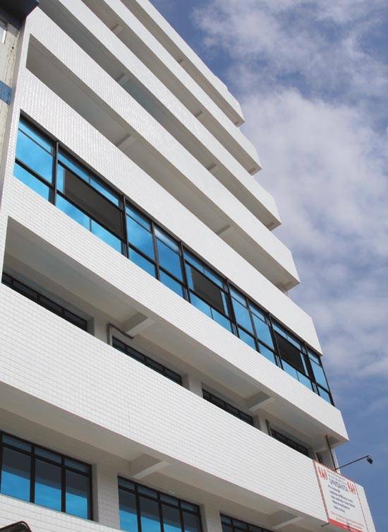 possui revestimento cerâmico na cor branca, com vidros espelhados azuis nas janelas Foto: Sandra Netto