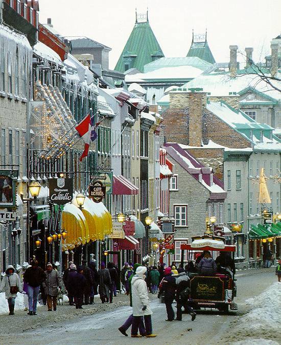Velho Mundo: por suas ruas cobertas de gelo circula "Le Tramway Royal", transportando os turistas.