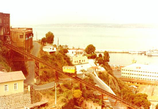 de uso normal na cidade de Valparaíso, no Chile, em foto de 1981, vendo-se ao fundo as instalações desse