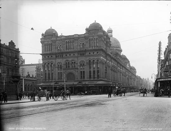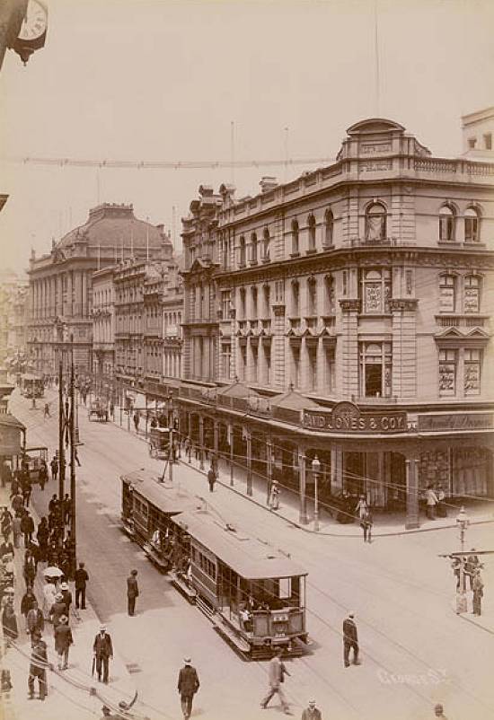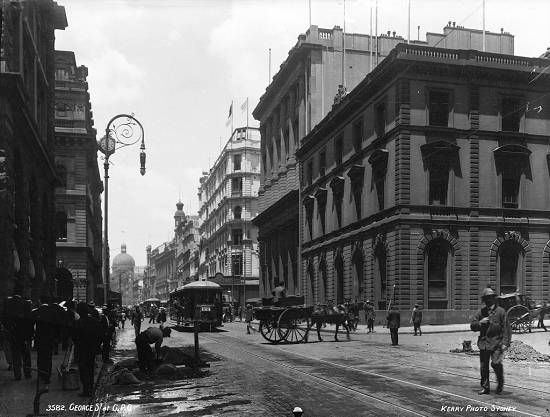 cerca de 1900, vendo-se o Queen Victoria Building ao centro, no lado esquerdo da via