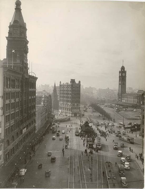 por óculo retro-iluminado, cerca de 1910 (data estimada pelas obras do Correio Central), com a Central Station à direita e a Railway Square