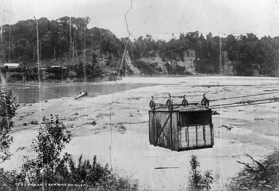 incomum bonde suspenso funicular operou na travessia do Rio Taramakau, na Nova Zelândia.
