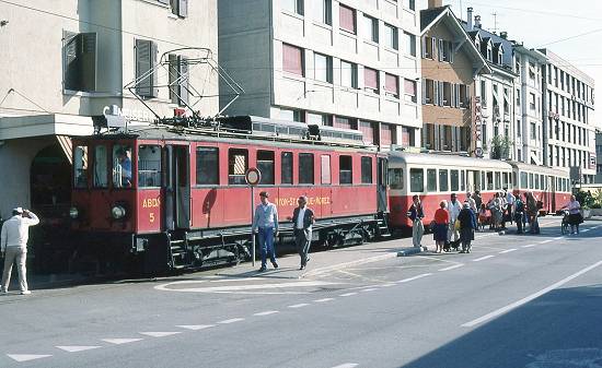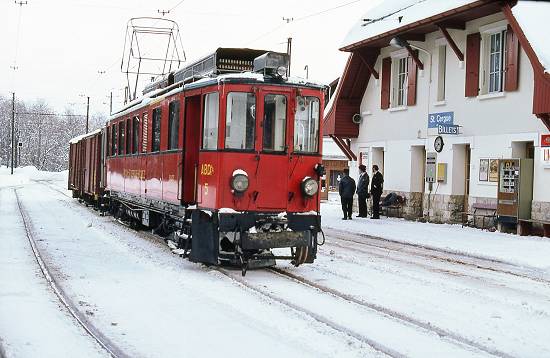 mercadorias, com o carro-motor 5, na estação de St. Cergue, na década de 1980