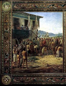 Braz Cubas lê o foral de vila, documento régio que eleva Santos à categoria de vila.