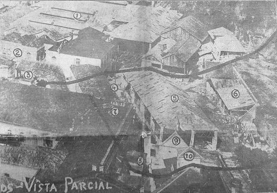 fotografia apanhada antes do tremendo desmoronamento, sendo destruídas as edificações contidas dentro da zona assinalada. Os números marcados no