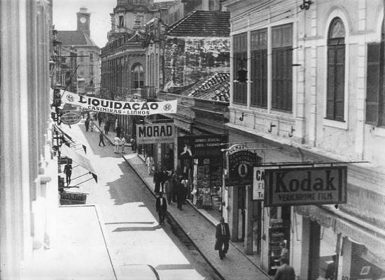 demolido, e pouco à frente a cúpula e a torre do edifício da Bolsa Oficial de Café, na esquina das ruas Frei Gaspar e XV de Novembro: