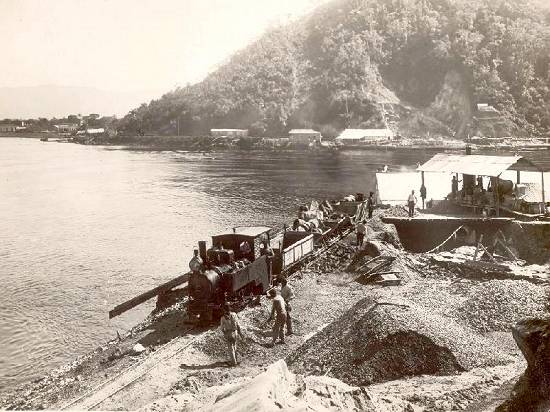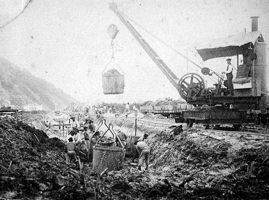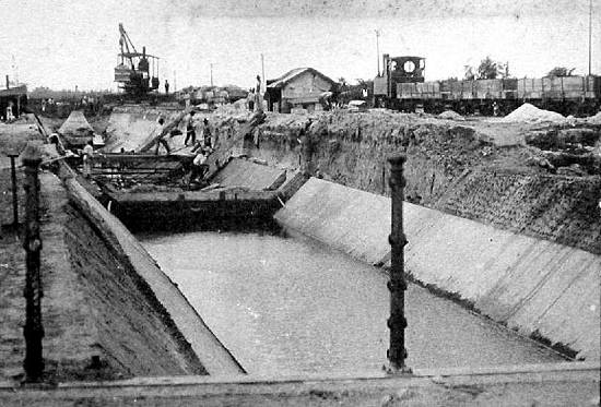 Como na imagem acima, esta mostra também o apoio ferroviário, ao lado do canal em construção. A locomotiva pertence ao patrimônio da então