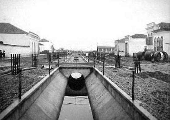 bombeiam esses esgotos para uma altura maior, permitindo assim reiniciar o percurso até alcançar as estações de tratamento e despejo dos efluentes. Esta foto é do início do século XX, quando da construção dos primeiros canais, na