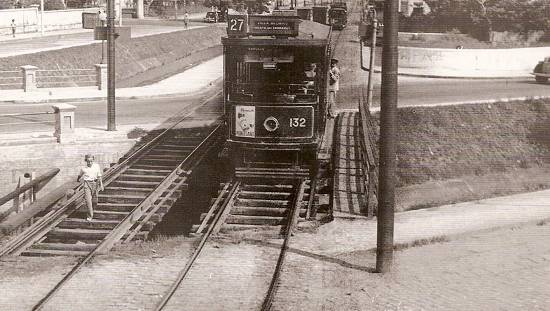 imagem de 1940, o bonde passa sobre a ponte do canal 1, em frente à Portuguesa Santista":
