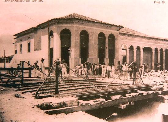 Bonde elétrico, sobre a ponte, cruza um dos canais santistas, no início do século XX: