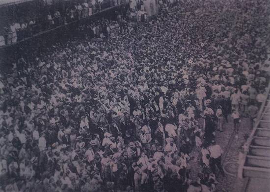 Armazém de Bagagem do porto santista, em 1934. O cais apinhado de pessoas, quando da partida do transatlântico italiano