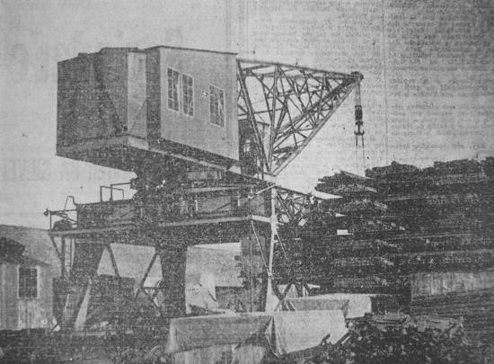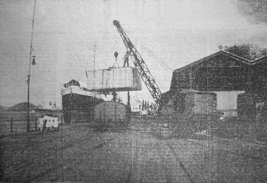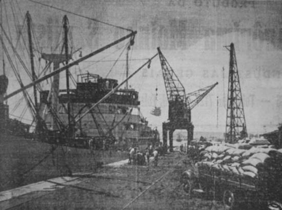 Embarque de café no novo cais do Saboó, vendo-se ao fundo o bate-estacas em serviço,