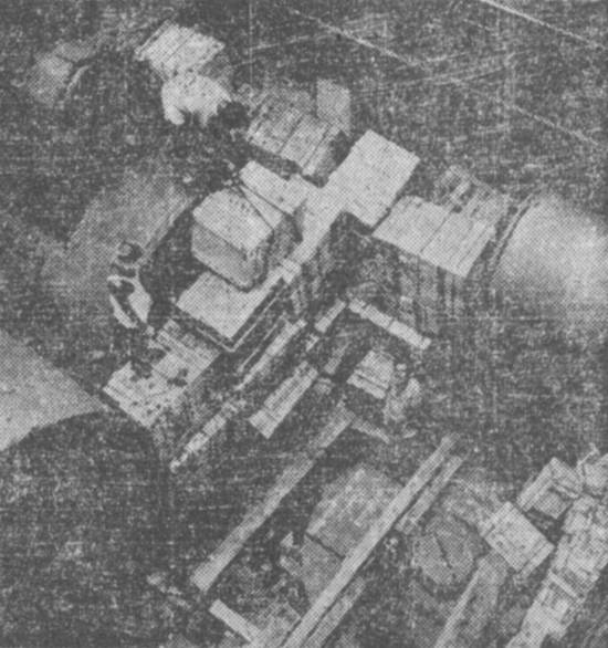 Neste clichê, vê-se, à direita, um dos poderosos guindastes hidráulicos empregados