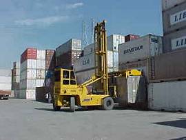 Santos, como o da empresa Depotrans, visto abaixo, onde uma empilhadeira Madal movimenta um contêiner frigorífico de 20 pés de comprimento - tendo