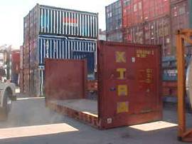 ao fundo pilhas de até cinco contêineres, para melhor aproveitamento do espaço - e um contêiner tipo flat-rack (aberto) aguarda sua carga: