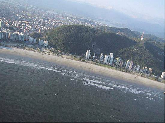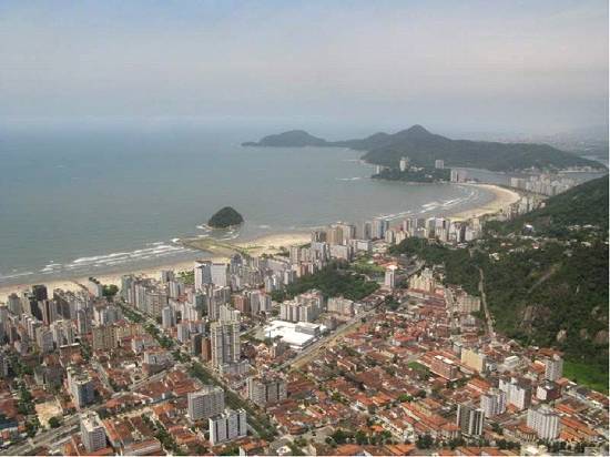 centro. À direita, as praias vicentinas e a Ilha Porchat, e ao fundo a cidade de Praia Grande: