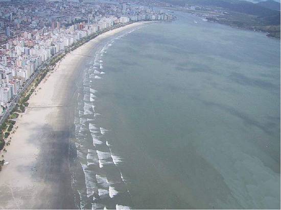 Praias santistas, tendo ao fundo a Ilha de Santo Amaro, com o município de