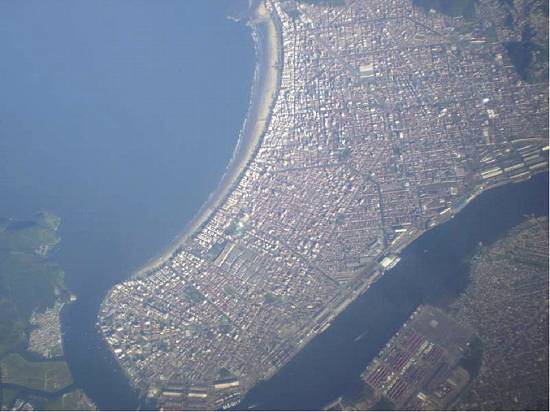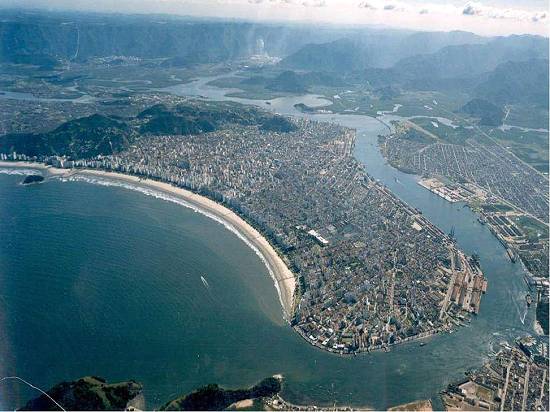 Santos e a ilha de São Vicente, tendo Guarujá em primeiro plano e a Serra do Mar ao fundo, com a