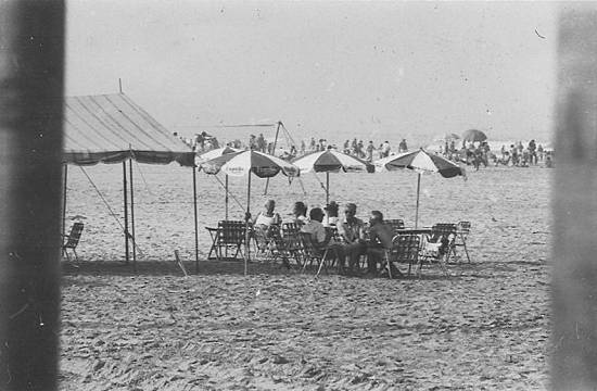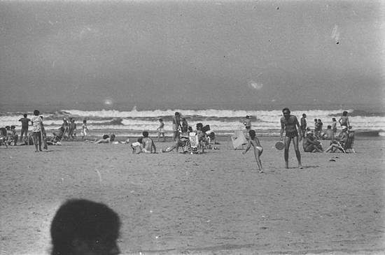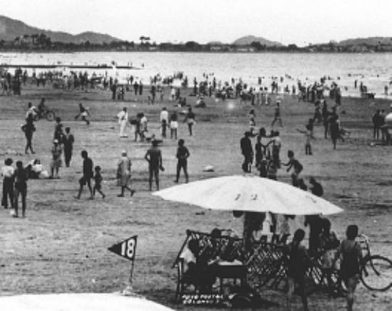 Durante a década de 40, os costumes de praia já se abrandavam, mas roupas sociais de verão e chapéus continuavam marcando a paisagem, vista desde a praia do Gonzaga, em direção à