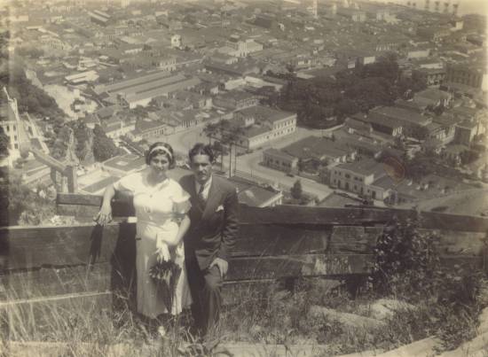 Este misto de foto familiar e cartão postal (com a marca Wessel) recebeu no verso a mensagem: "À D. Ernestina, lembrança do Ary e Lolita. Santos, 24/1/1934". A imagem foi feita no caminho de acesso