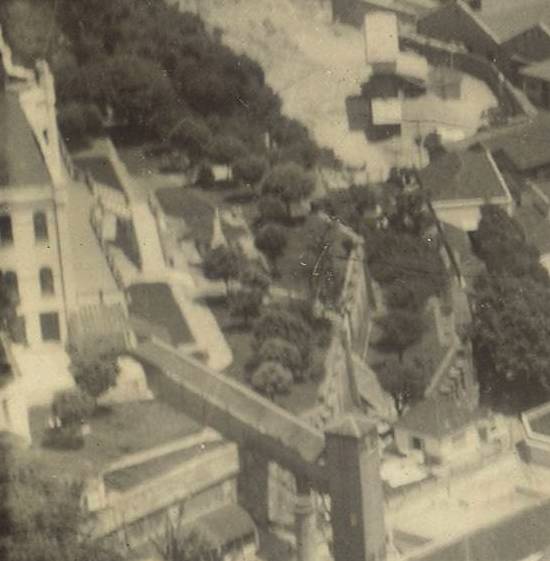 No pormenor do lado esquerdo da foto, vê-se, no sopé do morro, as antigas instalações da Santa Casa:, e uma pedreira que funcionava onde seriam depois