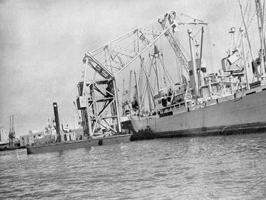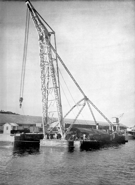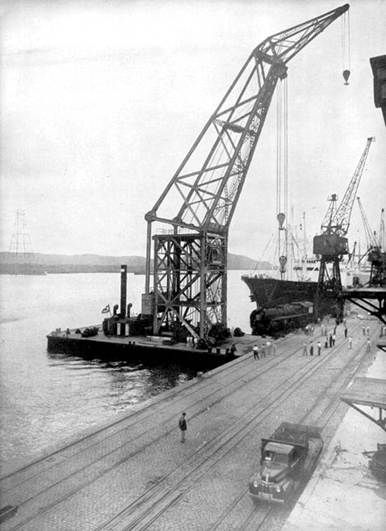 Outra vista da cábrea Sansão descarregando no cais uma locomotiva retirada de