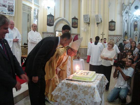 com as velas apagadas pelo prefeito e pelo bispo diocesano, ao som do tradicional "Parabéns a você...":