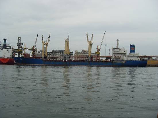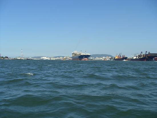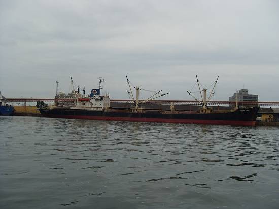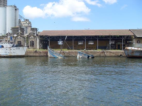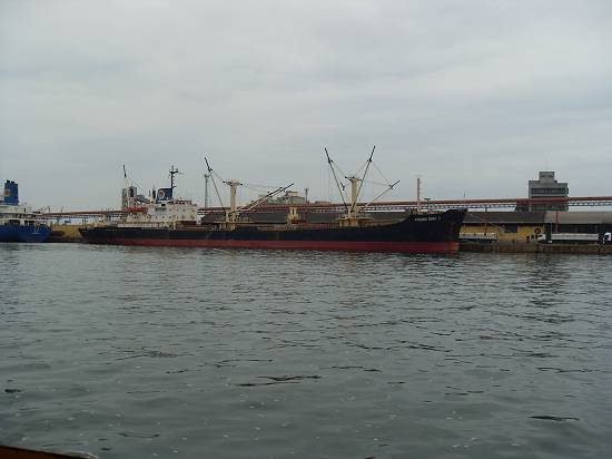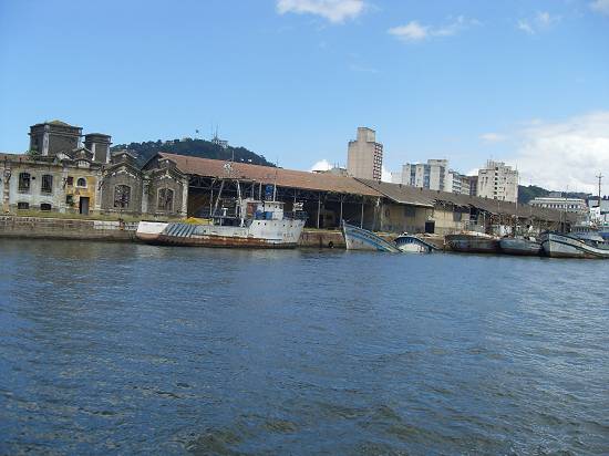 Perto do armazém 8, com o moinho da Bunge, o barco Orion e embarcação semi-submersa