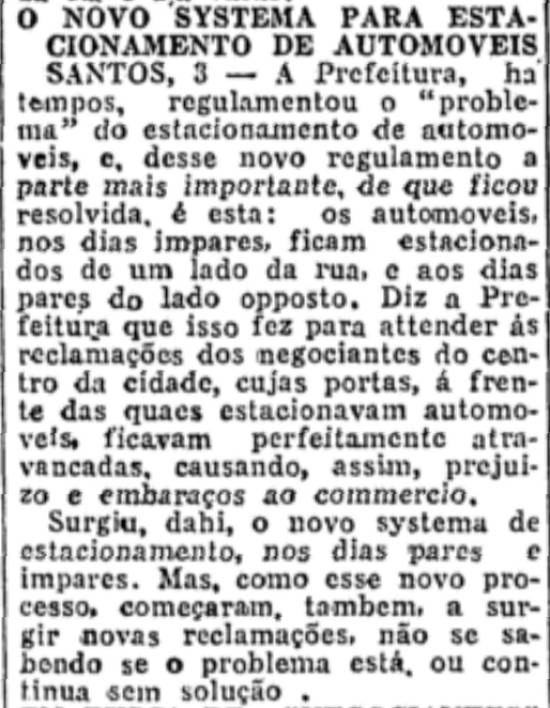 SANTOS, 3 - A Prefeitura, há tempos, regulamentou o "problema" do estacionamento de automóveis e, desse novo rgulamento a parte mais importente, de que ficou resolvida, é esta: os automóveis, nos dias ímpares, fidcam estacionados de um lado da rua, e aos dias pares do lado oposto. Diz a Prefeitura que isso fez para atender às reclamações dos negociantes do centro da cidade, cujas portas, à frente das quais estacionavam automóveis, ficavam perfeitamente atravancadas, causando, assim, prejuízo e embaraços ao comércio.