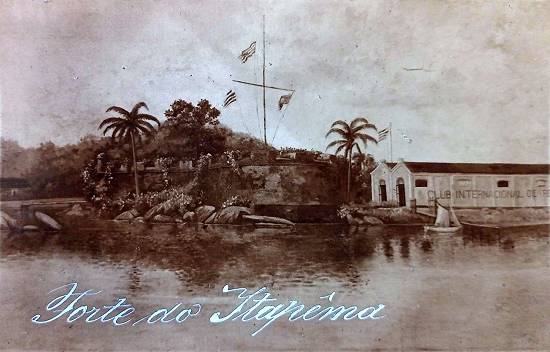 Defronte ao porto santista, no distrito guarujaense de Vicente de Carvalho, o fortim do Itapema, visto ainda sem a característica torre erguida a partir de 1905, tinha no início do século XX a companhia das instalações náuticas do Club Internacional de Regatas:
