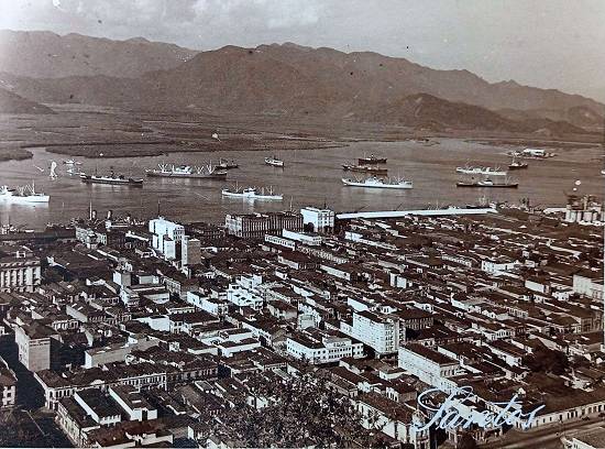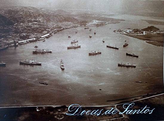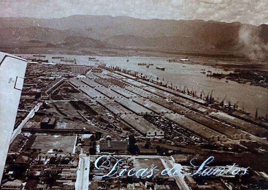 As quatro fotos seguintes do álbum são vistas aéreas da Cidade de Santos e das instalações portuárias: