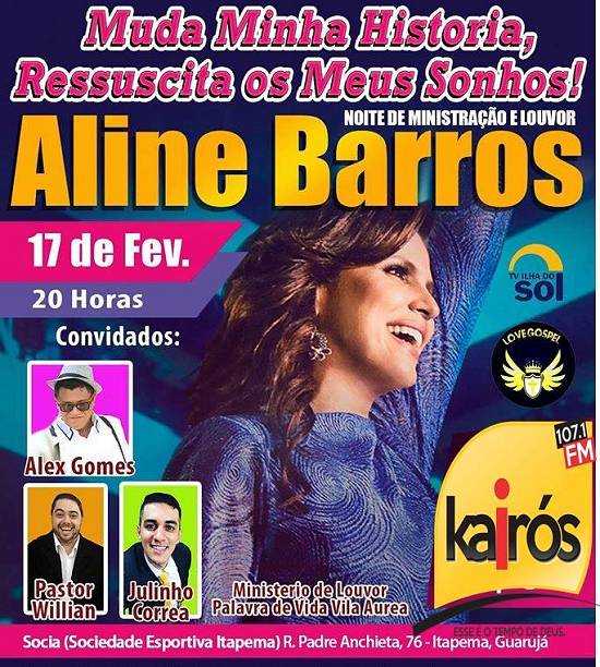 Cartaz de espetáculo da cantora Aline Barros no Guarujá, com apoio da rádio e da TV Ilha do Sol