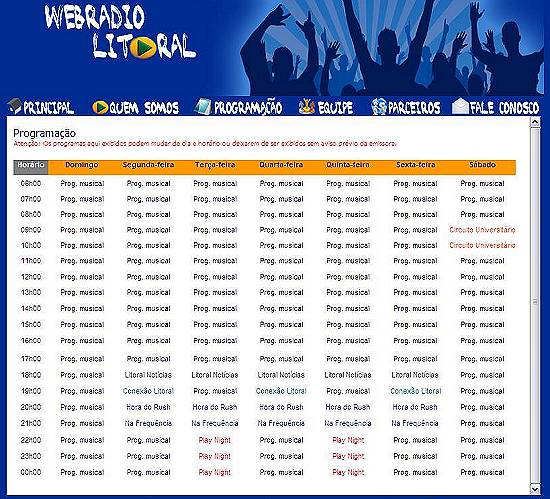 músicas nos estilos Pop, Rock, MPB e outros, além das 24 horas de programação farão parte da sua vida, com o carinho e toque especial de atenção que a WebRádio Litoral teve e continuará tendo com você, nosso querido ouvinte.