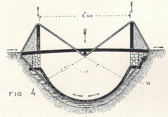 dobra e mergulha no terreno, formando duas abas de resistência e de apoio para os taludes das terras, também inclinados a 45 graus e revestidos de