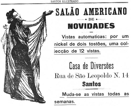 Salão Americano de Novidades, no Centro santista, anunciava em 1903 "vistas automáticas: por um nickel de dois tostões, uma colecção de 12 vistas"