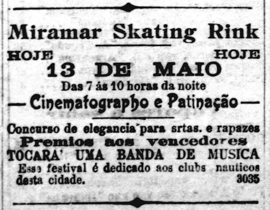 Miramar Skating Rink - anúncio e nota da programação cinematográfica do dia 13 de maio Jornal A Tribuna 13/5/1910 página 1