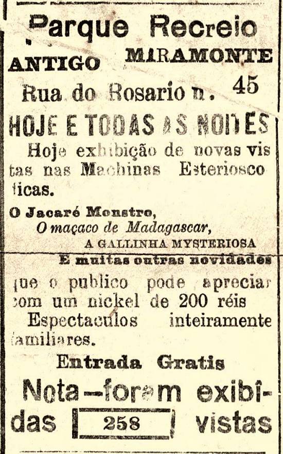 c.1902/c.1908 – Funcionava na Rua do Rosário, 44 (atual R. João Pessoa) o Parque Recreio (antigo Miramonte), de José Amarante, apresentando todas as noites "exhibição de novas vistas nas Machinas Esterioscodicas. O Jacaré Monstro, O macaco de Madagascar, A Gallinha Mysteriosa. E muitas outras novidades que o publico pode apreciar com um nickel de 200 réis. Espectaculos inteiramente familiares. Entrada Gratis. Nota – foram exibidas [842] vistas", como publicado no Diário de Santos de 25/12/1902, e quase igual ao anúncio de 3/10/1902 nesse mesmo jornal, com a diferença de terem sido exibidas 873 vistas.