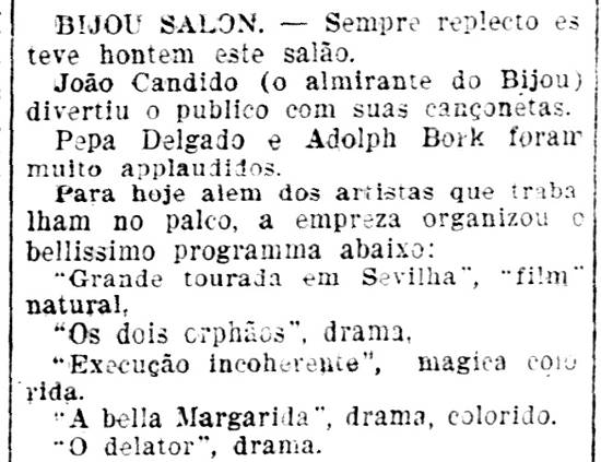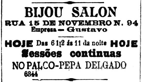Como neste caso, uma expressão hiperbólica atualmente incomum era muito usada na imprensa do início do século XX para se referir a algum afluxo muito grande de público a determinado lugar: "enchente colossal". O cinema logo fechou, apesar da criatividade que demonstrou nas primeiras parcerias, como a firmada com um açougue... [[Mais...]].