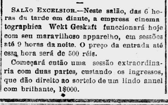 15/8/1908 a 31/12/1910 – Salão Excelsior, no Centro, apresentava sessões contínuas de cinema com material da Empresa Cinematographica Wekt Geskaft. Em 31/12/1910 o jornal A Tribuna informava que o cinema seria fechado, devido às más condições sanitárias.