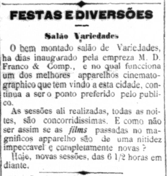 11/1908 a ... – Salão Variedades, sucessor de estabelecimento homônimo fechado em 1904. Consta em A Tribuna de 19/11/1908 o registro sobre o "bem montado salão de Variedades, há dias inaugurado pela empresa M. D. Franco & Comp., e no qual funciona um dos melhores aparelhos cinematográficos que têm vindo a esta cidade". Ainda: "As sessões ali realizadas, todas as noites, são concorridíssimas. E como não ser assim, se as films passadas no magnífico aparelho são de uma nitidez impecável e completamente novas?"
