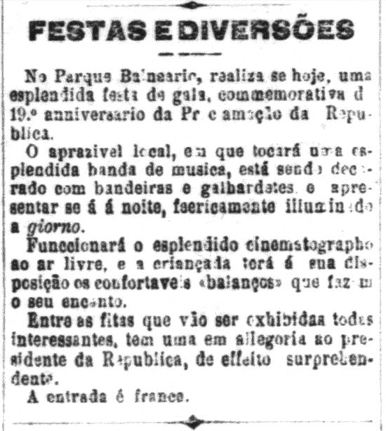 Em 16 de abril de 1909, também em A Tribuna: "Sempre que o tempo permitir – cinematógrafo ao ar livre – concertos de pianola – tiro ao alvo – balançadores – outras diversões. Às quartas-feiras Soirée d’Elite – Concerto pela Banda Municipal. Entrada Franca. Ao Parque". Em 29/5/1910 era citado no mesmo jornal: "PARQUE BALNEARIO. – Funcção cinematographica em que serão exhibidos os belíssimos films: Um drama indiano, Com um rapaz não se brinca e outros muitos".