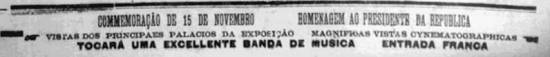 Anúncio em todo o rodapé da página 1 do Jornal A Tribuna de 15/11/1908 e nota na página 3