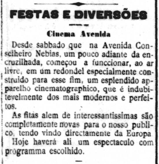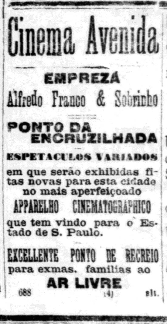 27/2/1909 a c.7/12/1923 – Cinema Avenida (primeiro desse nome), empresa de Alfredo Franco & Sobrinho, começou a funcionar naquele sábado, 27/2/1909, na Avenida Conselheiro Nébias, "um pouco adiante" do Ponto da Encruzilhada, apresentando "espetáculos variados em que serão exibidas fitas novas para esta cidade no mais aperfeiçoado aparelho cinematográfico que tem vindo para o Estado de São Paulo - Excelente ponto de recreio para exmas. famílias ao ar livre". Em 6/5/1909, promoveu sessão cinematográfica em benefício das vítimas dos terremotos de Portugal.