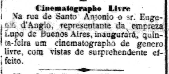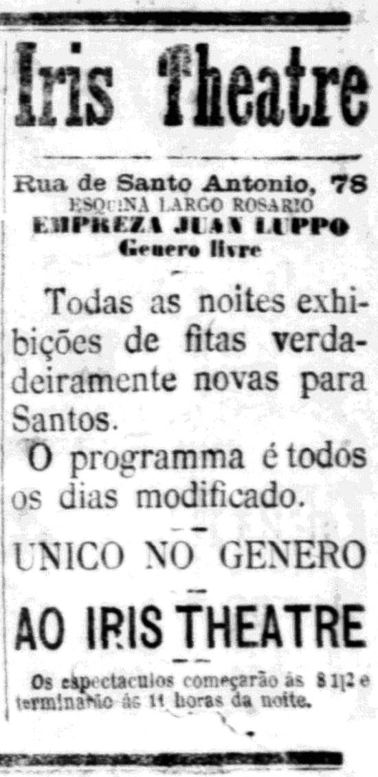 4/3/1909 – Conforme noticiava A Tribuna no dia 2: "Cinematógrafo Livre – Na Rua de Santo Antonio o sr. Eugênio d’Angio, representante da empresa Lupo de Buenos Aires, inaugurará, quinta-feira, um cinematógrafo de gênero livre, com vistas de surpreendente efeito". Seria o Iris Theatre, surgido dois dias depois.