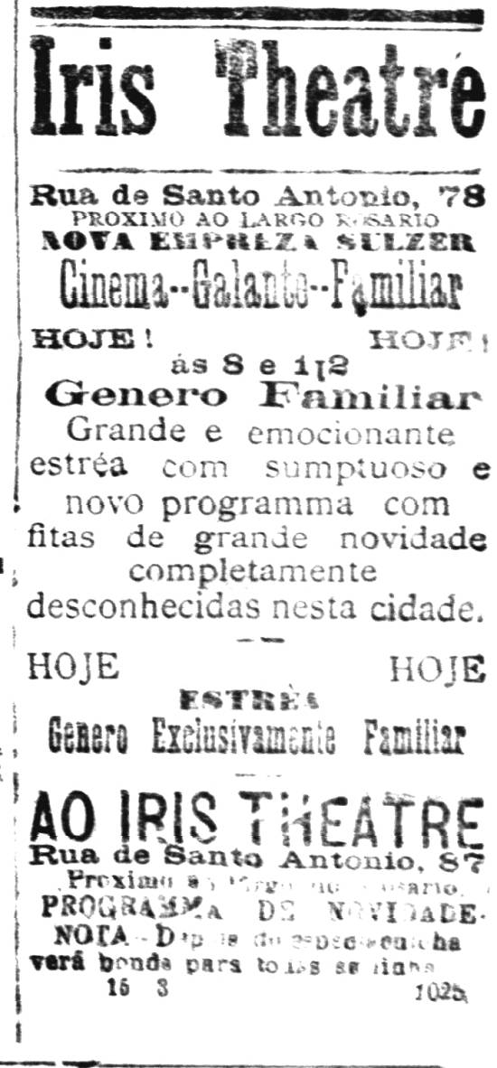 6/3/1909 a 12/4/1909 – Iris Theatre, da Empreza Juan Luppo, instalado num armazém da então Rua de Santo Antônio (Rua do Comércio), 78, esquina com o Largo do Rosário (hoje Praça Rui Barbosa), no Grande Salão Internacional, com filmes como A Viúva Alegre ("espetáculo completo ao qual não podem assistir senhoritas nem meninos"). A empresa pedia que os frequentadores não fumassem e informava que ao final haveria bondes para todas as linhas (o que não foi cumprido pela empresa de bondes, aliás). Em 1º de abril estreavam as sessões "Cinema galante", exclusivamente familiares. O estabelecimento durou onze dias mais.