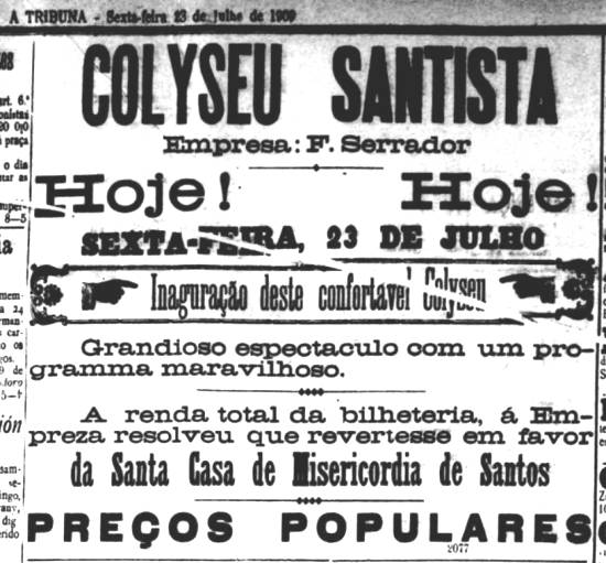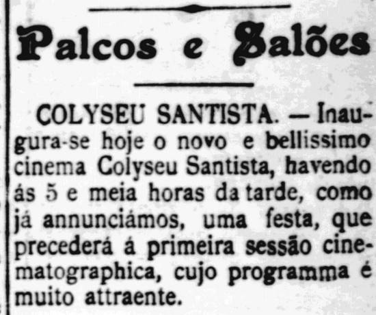 23/7/1909 a 21/6/1934 – Theatro Coliseu Santista, depois cine-teatro, na R. Amador Bueno, 237, confluência com Rua Braz Cubas, Centro. As primeiras instalações desse Coliseu, para espetáculos esportivos (pelota e ciclismo), foram inauguradas em 14/7/1897.