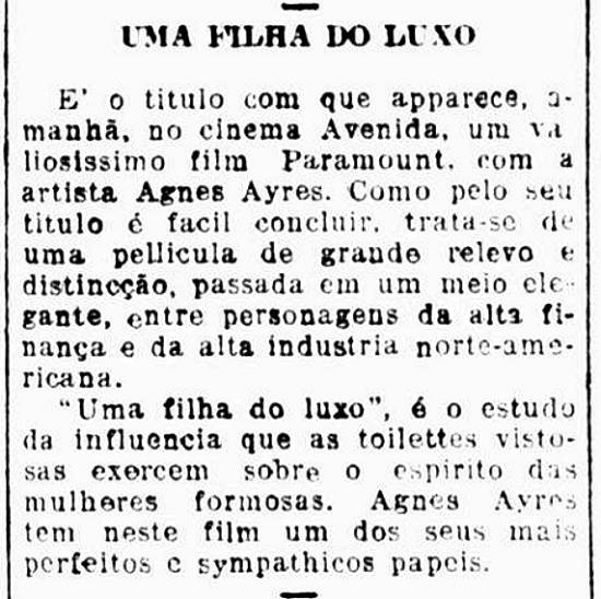 "Uma Filha do Luxo" era uma comédia de costumes da época, em cartaz no Avenida