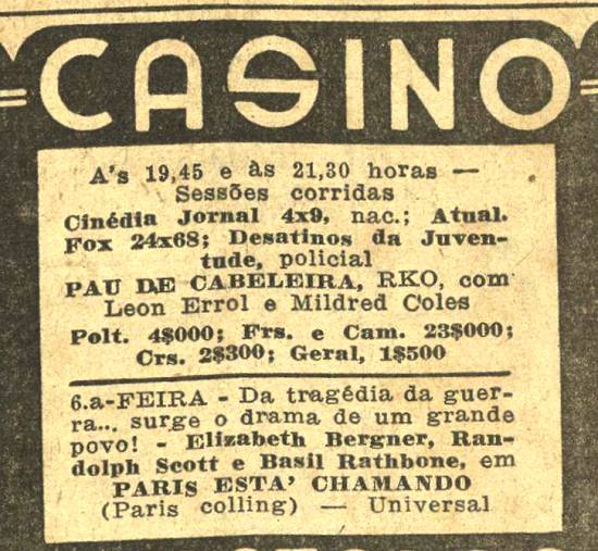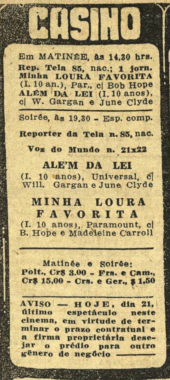 Em 31/5/1943, saía nesse jornal um pequeno anúncio de venda de mobiliário e materiais resultantes da demolição do Cine Casino. Em 30/4/1946, o decreto-lei 9.215 proibiu o funcionamento dos cassinos no Brasil, mas alguns continuaram, de forma clandestina.
