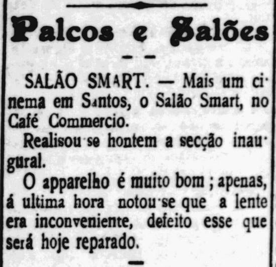 Salão Smart, outro de efêmera existência, daria lugar um ano depois ao Ideal Cinema Jornal A Tribuna, 8/8/1909, página 2