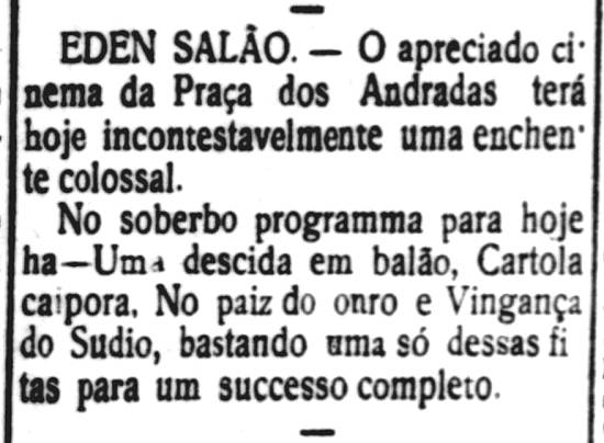 23/6/1909 – Eden Salão – por algumas semanas, na Praça dos Andradas, 11 e 13, com capacidade para 300 pessoas, controlado pela Empresa Serrador & Mendes. O som era garantido pelo quinteto do maestro Bellarmino.